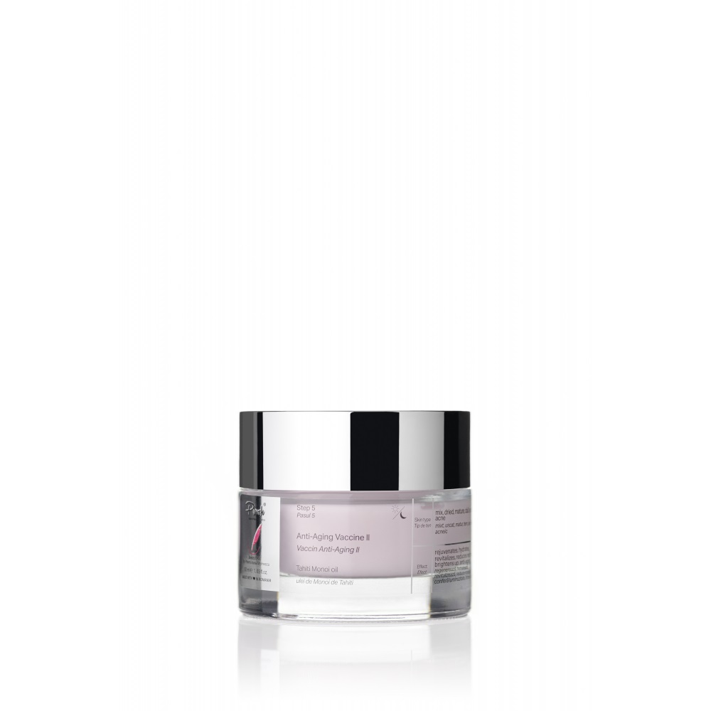 Poate cea mai complexă formulă antirid preparată în laboratorul Plush, crema este un produs versatil, care se adaptează cu succes pe diverse tipuri de ten: acneic, matur, sensibil, mixt, lipsit de vitalitate sau uscat. Ingredientele active complexe regenerează, hidratează și revitalizează tenul, reduc roșeața, conferă luminozitate, dar în același timp ajută la estomparea și prevenirea apariției ridurilor. Activul principal din această formulă este patentat ca vaccin anti-age, formula fiind ”un vaccin antiîmbătrânire” care ne scutește de neplăcutele ace, anticorpi sau microorganisme.